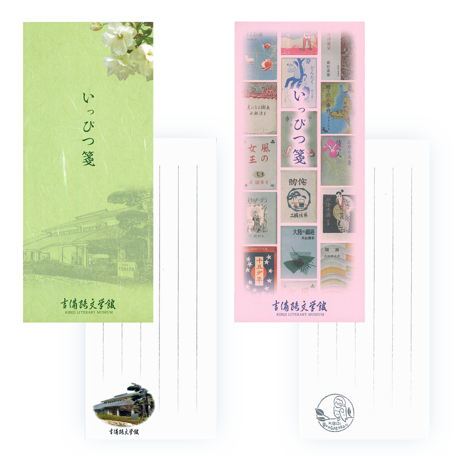 (画像左) 緑色の表紙/便箋に文学館外観の写真入り