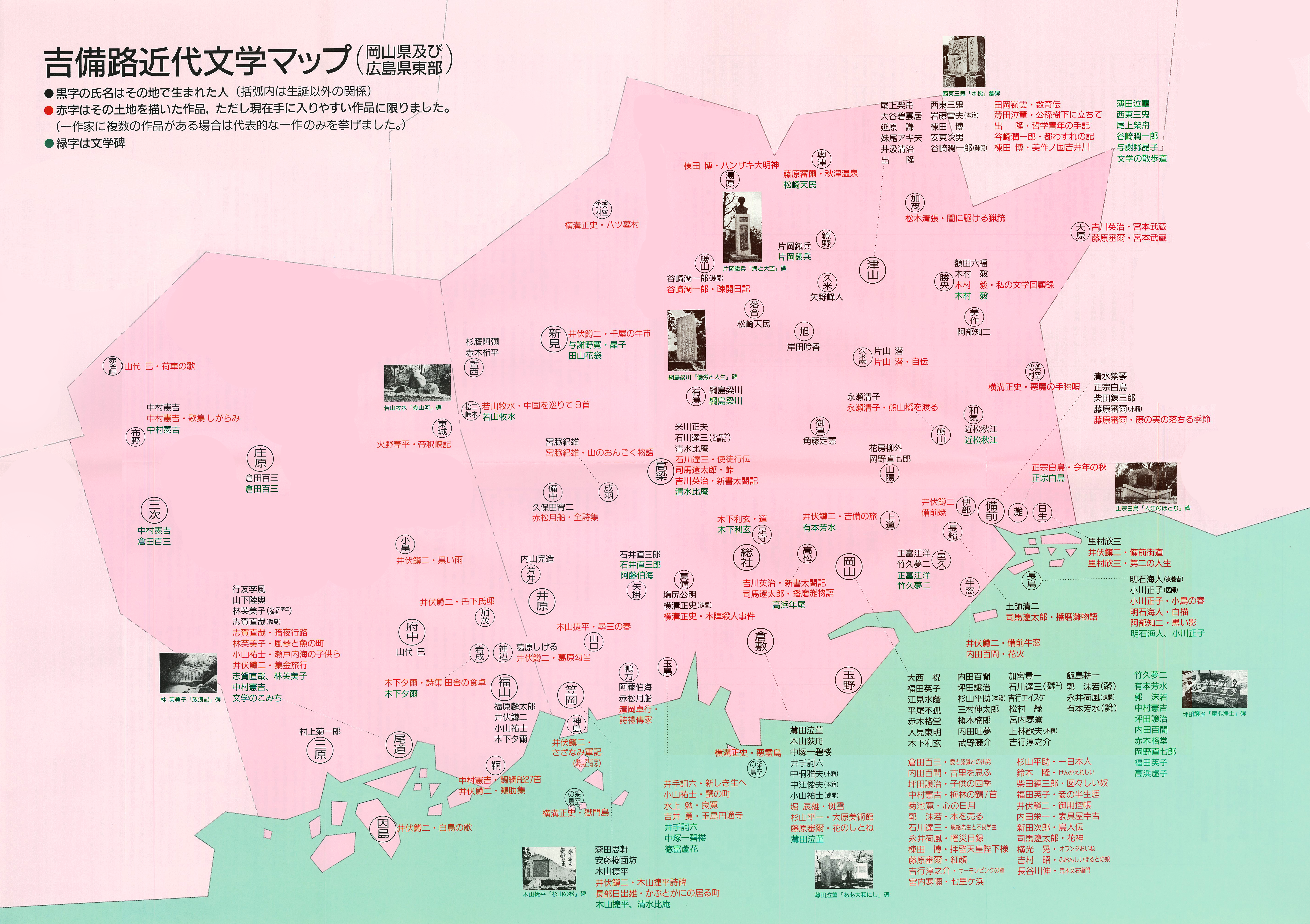 明治以降、吉備路(=岡山県及び広島県東部)の中で、作家の出生地、作品のモデルになった土地、文学碑の所在地を一枚の地図にまとめました。