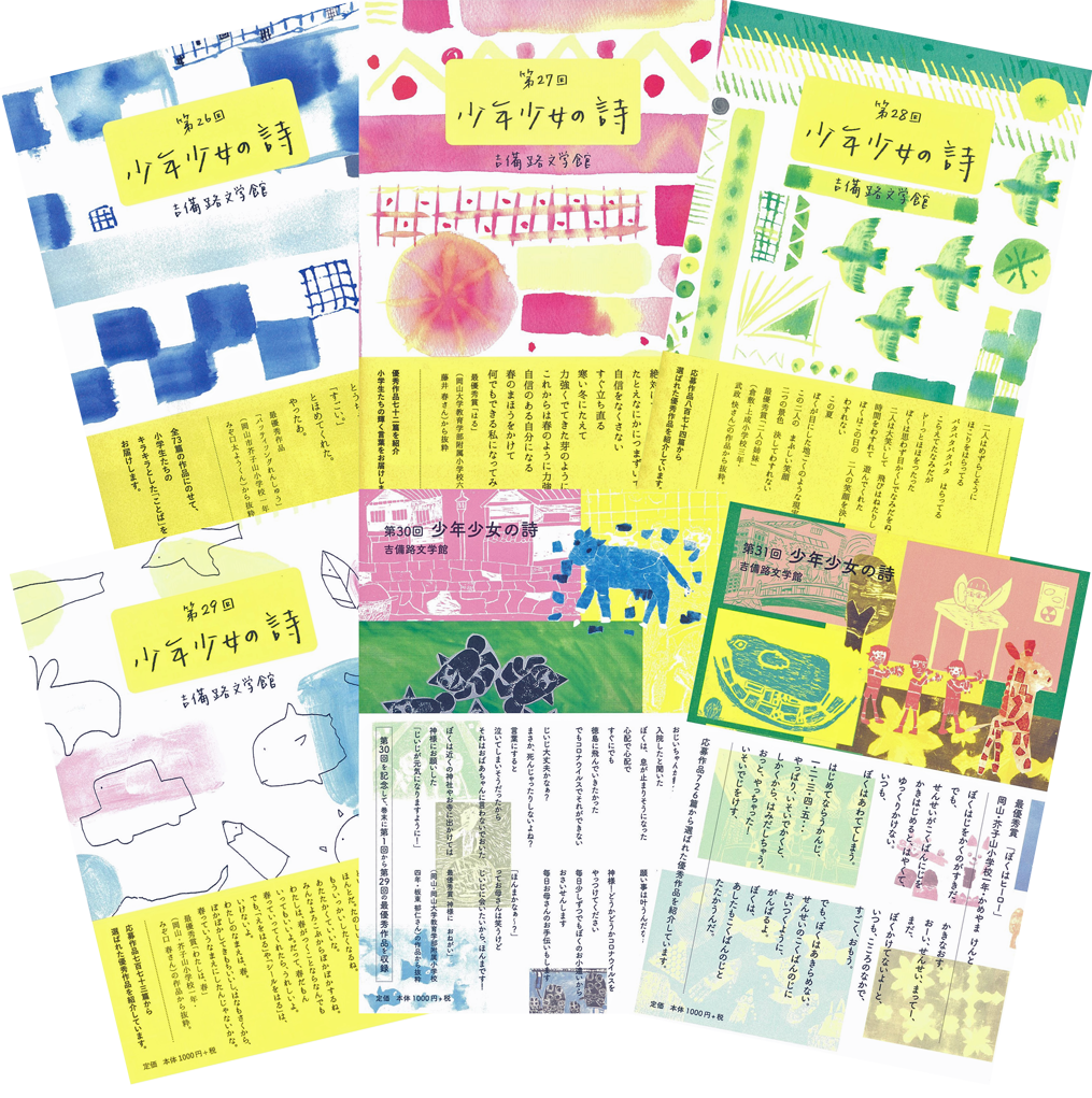 当館では、毎年、岡山県内の小学生を対象に自由詩を募集し、その中から優秀作品をまとめて詩集『少年少女の詩』として刊行しています。1991年の開始より30年以上、子どもたちの素直でのびのびとした表現や、時にするどく、豊かな感性に触れることができる詩作品を紹介し続けています。